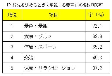 大手旅行会社のATBが行った調査によると、旅行先を決めるときに重視する要素として、「景色・景観」を求める人が7割を越えていることがわかった。これは昨年に比べ約21%の増加で、はじめて「食事・グルメ」を上回った。