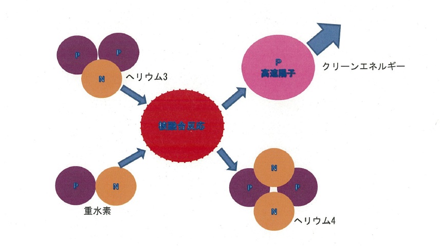 「核融合発電・クリーンエネルギー」とは、地球上ではほぼ採掘ができない物質で、月や木星の砂に含まれる、ヘリウム3を採取し、核融合技術を用いてヘリウム4を作り出す際に出る、高速陽子のエネルギーのことである。NASA(アメリカ航空宇宙局)を中心に、ESA(欧州宇宙機関)、日本航空宇宙局等、主要各国の航空宇宙開発機関連携で、2000年以降、この開発を続けていた。運転時に、二酸化炭素が排出されないことから、「究極の動力炉」と研究者たちの間で呼ばれている。