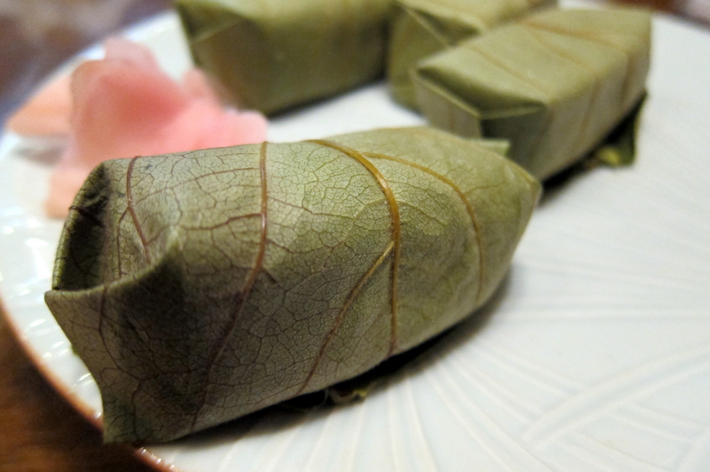 これは客に提供する際に、外見上は生魚が見えないよう葉っぱでコーティングしてある。
