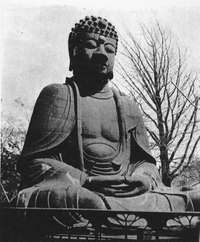 上野の大仏は、寛永8年(1631年)に越後村上藩主、堀直寄が戦死者慰霊のため漆喰の釈迦如来坐像を建立したが、17世紀半ばに地震による倒壊によって、金銅像として再建されたものが、1923年の関東大震災によって頭部が落下、更に1940年に戦時の金属類回収令によって顔面部を除く頭部、胴部以下が供出され、消滅していた。